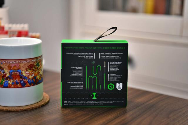 包装盒不大,由于是入耳式设计所以也就是一个水杯大小的小盒子,正面的包装和设计风格依然是雷蛇一贯的配色和元素。